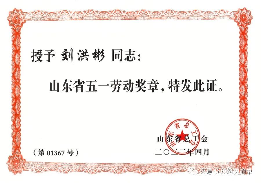 ▲榮獲山東省五一勞動獎章榮譽證書